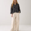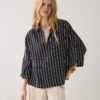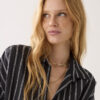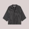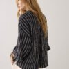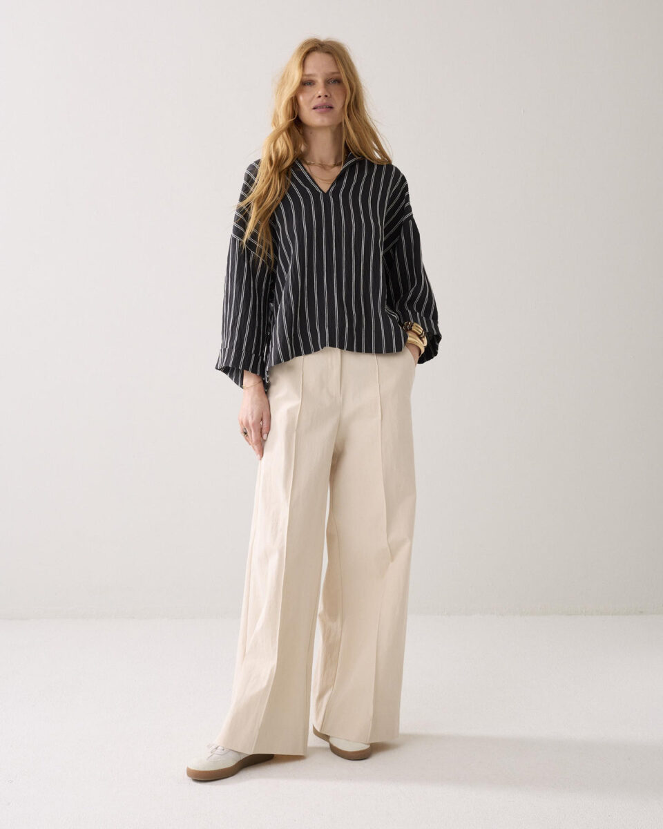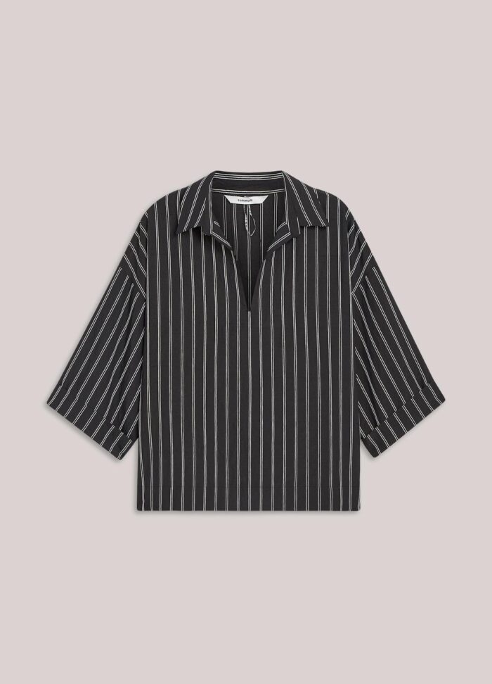 Top in cotton fabric woven with chenille yarn: tactile stripes. The top has an open split collar, lowered sleeve insets and wide, straight sleeves with turn-ups.