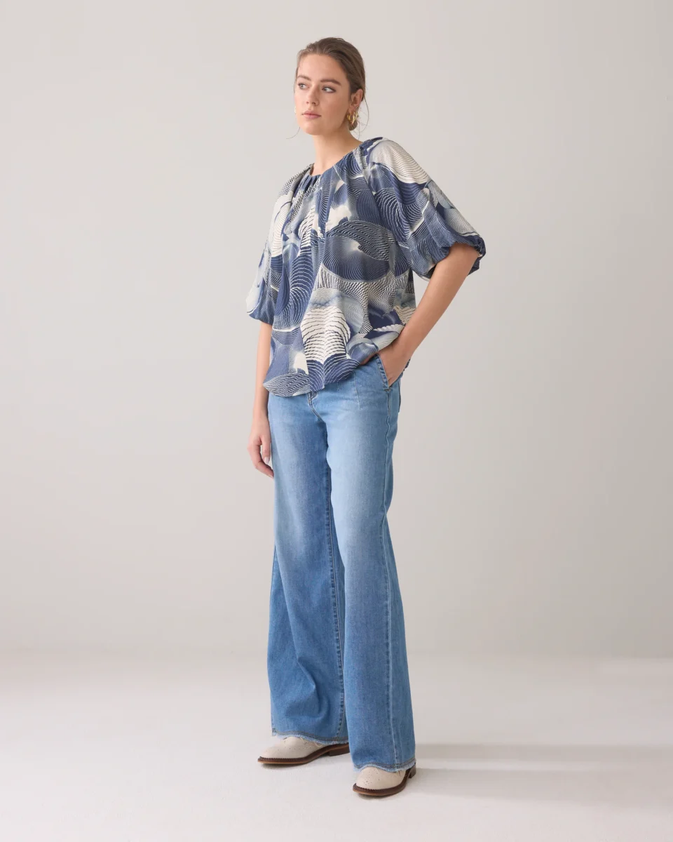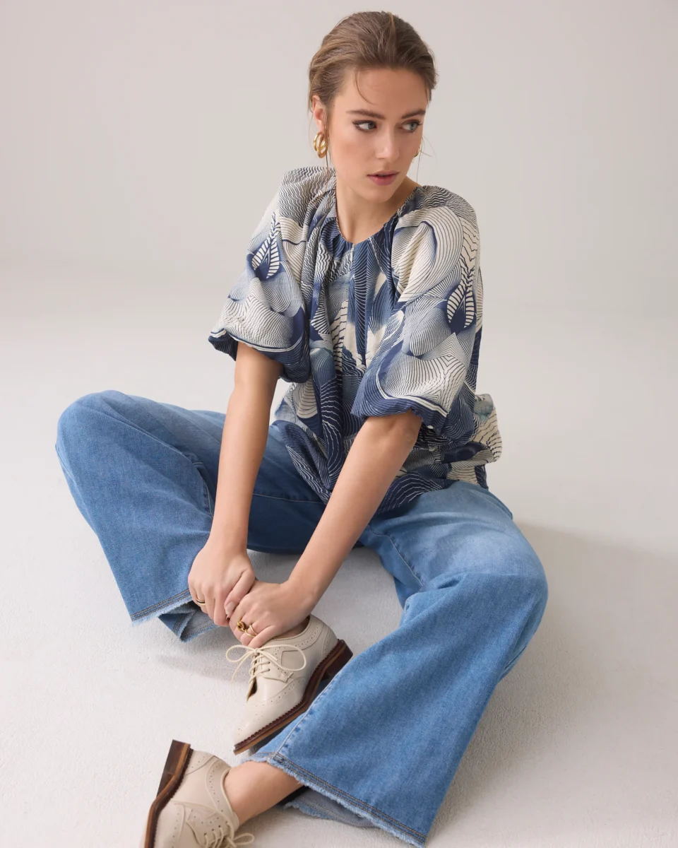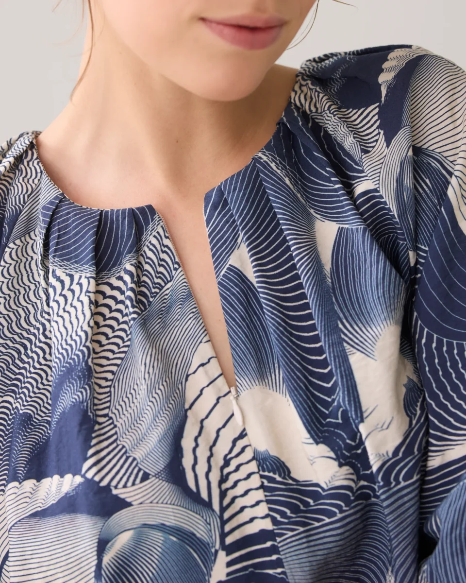 This top has short balloon sleeves with elastic at the bottom for extra volume. The pleated neckline features a concealed zip and the top has a roomy fit.