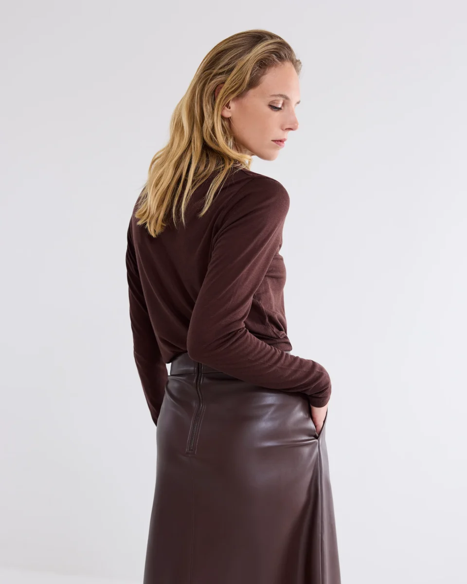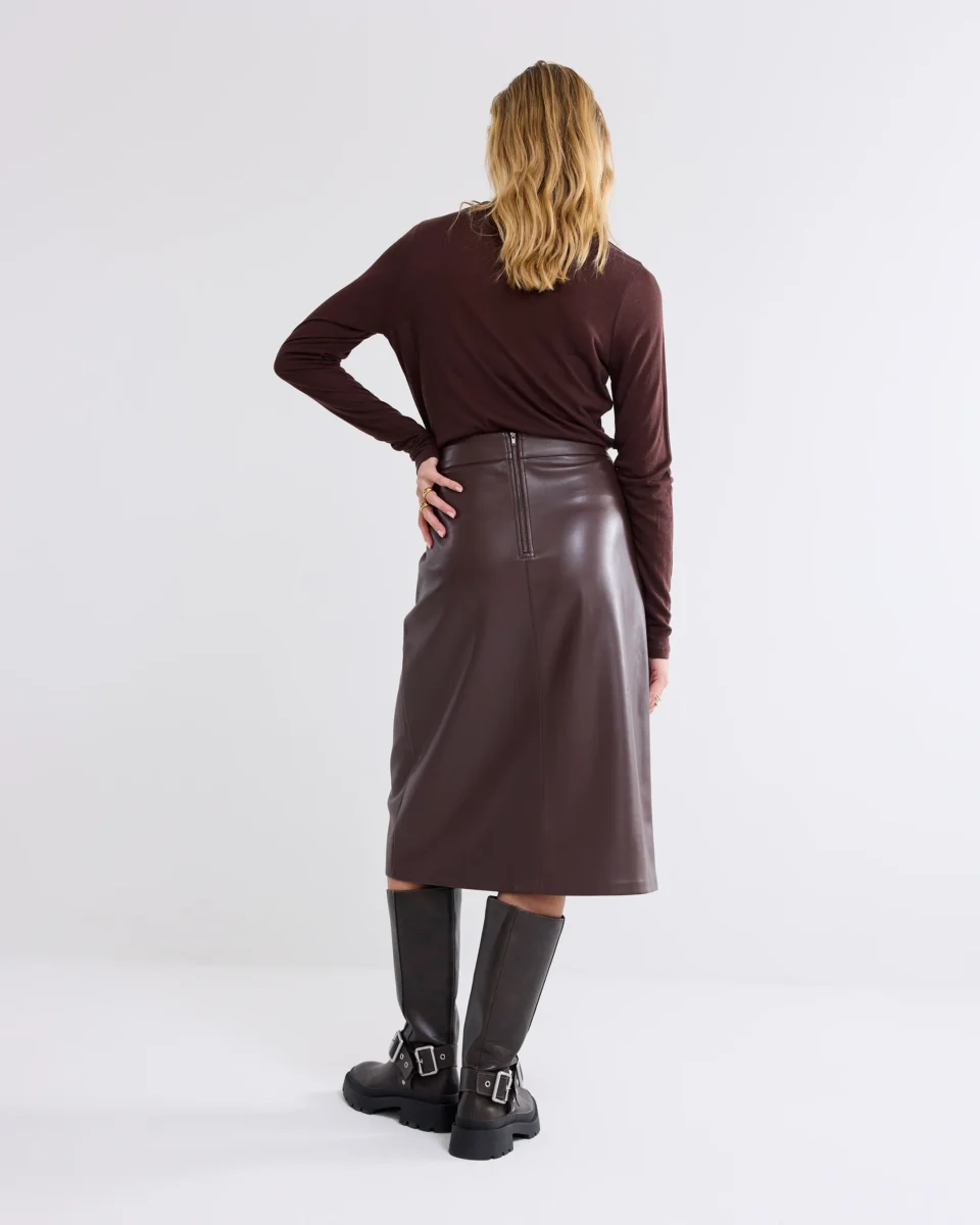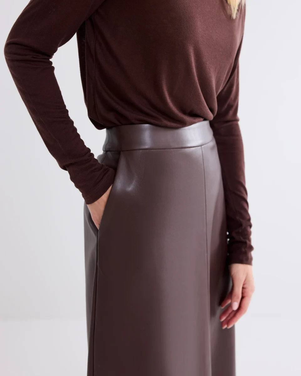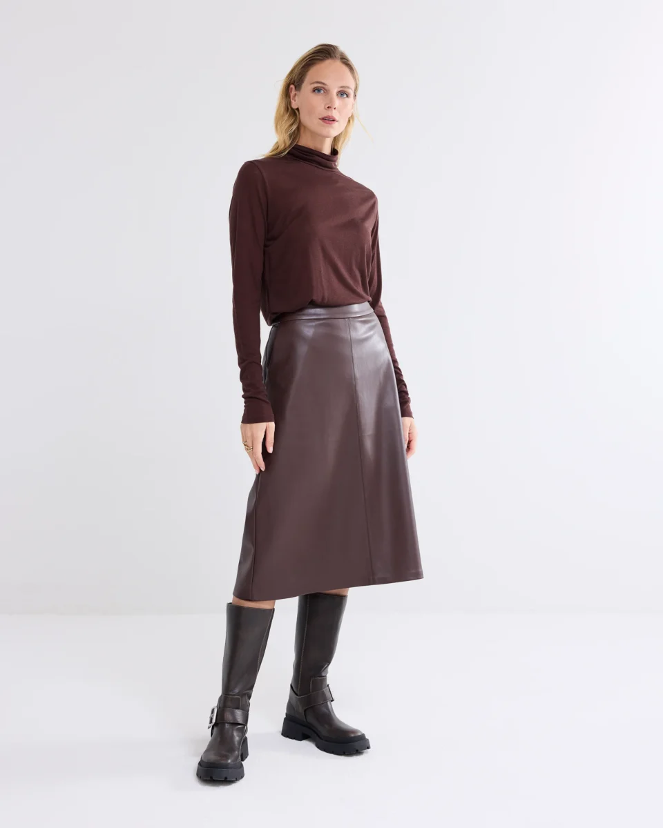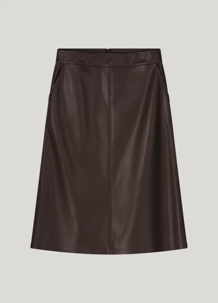 Vegan leather skirt of stretch quality with an A-line fit. The skirt has a zipper at the back and side pockets.