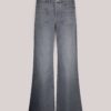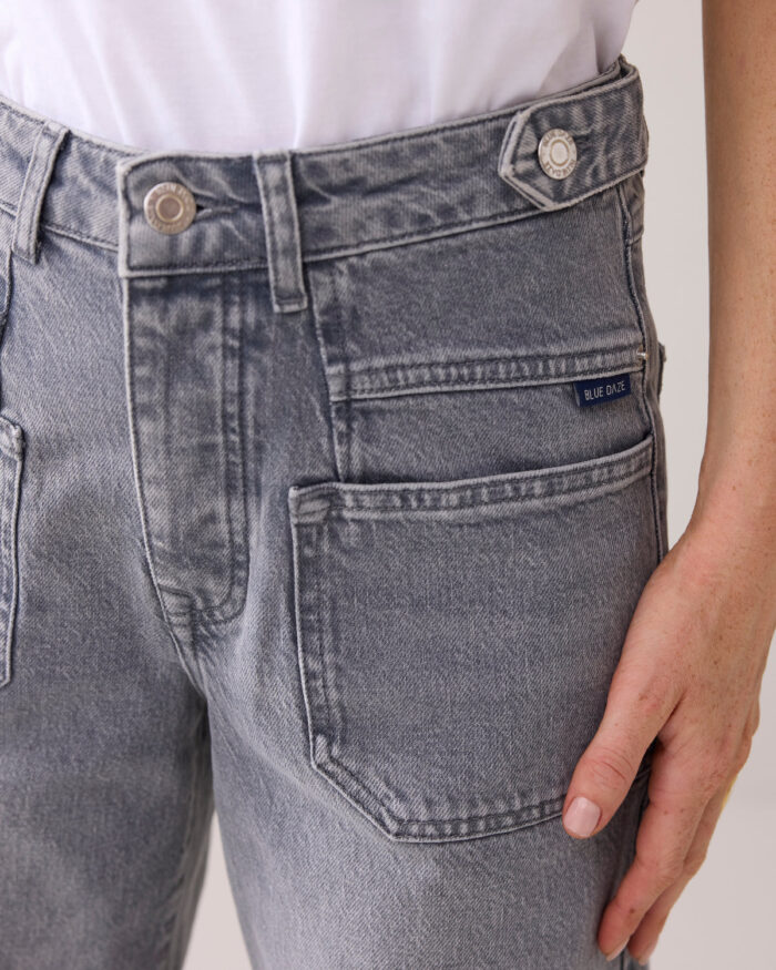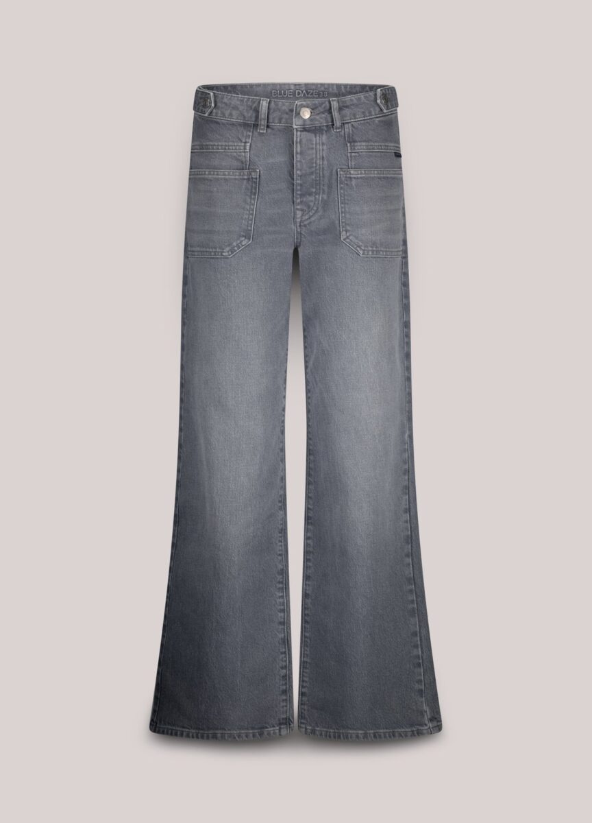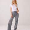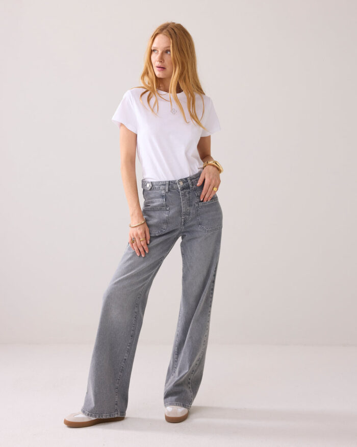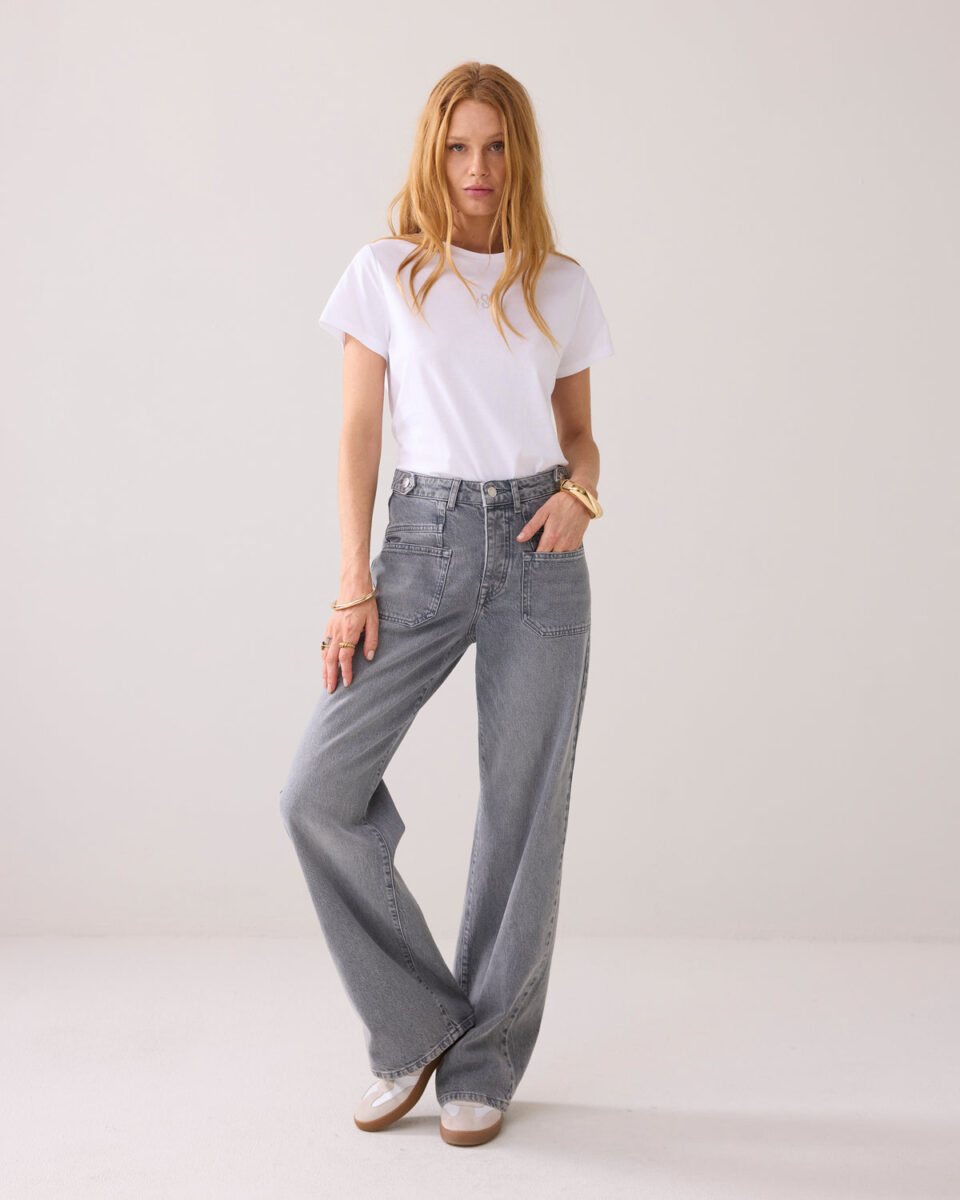 Wide-leg jeans in stretch denim with workwear pockets. The trousers have a mid-rise waist and fit snugly on the hips.