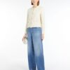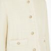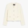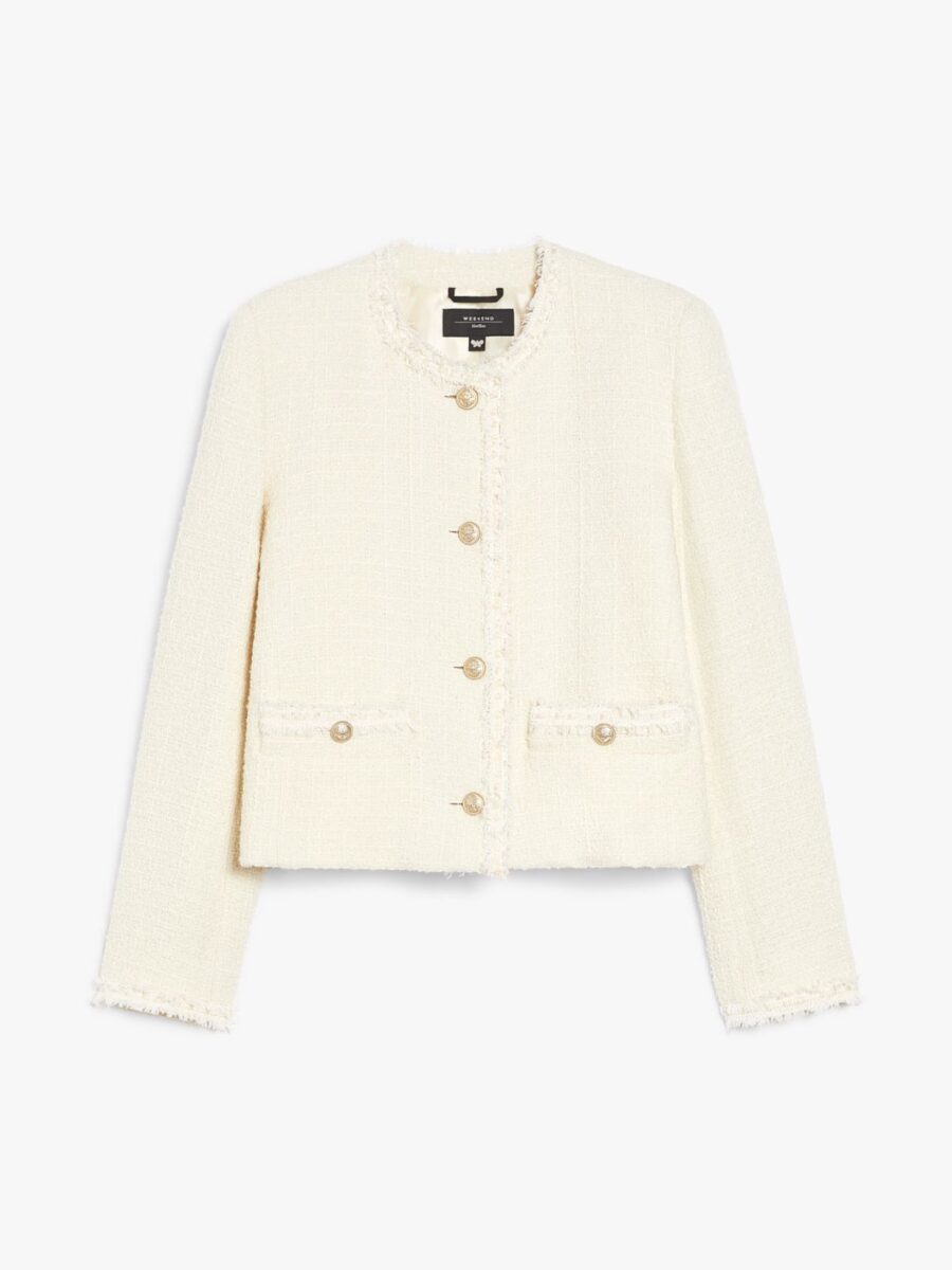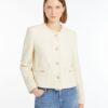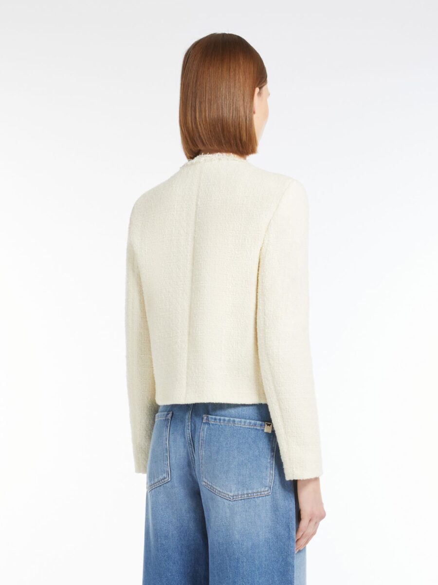 Short single-breasted jacket in wool-blend fabric with a lightly embossed texture. The straight-fit model boasts a round neck, long set-in sleeves and buttoned flap-adorned welt front pockets. Embellished with fringed passementerie trims and a branded metal button fastening.
