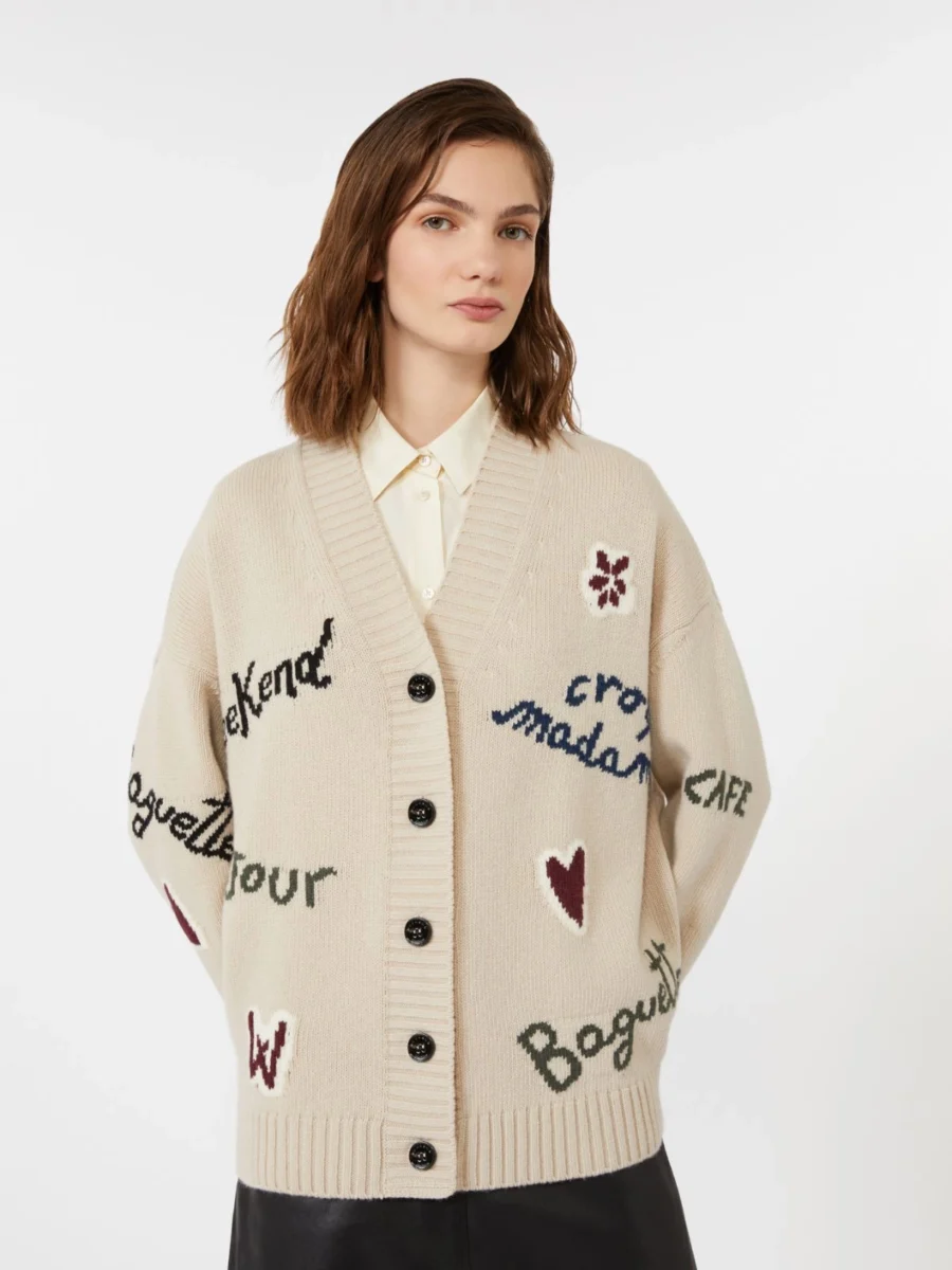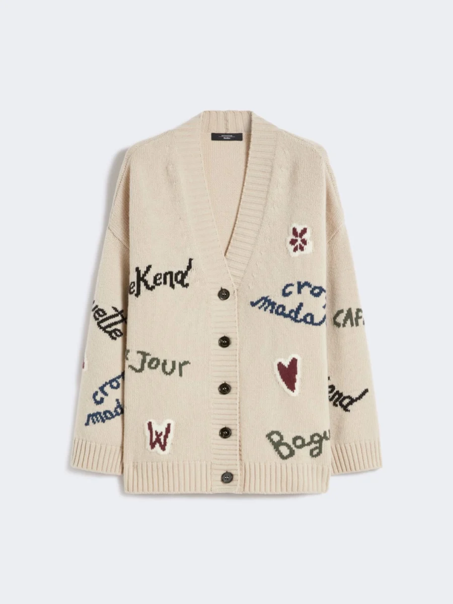 Oversized cardigan, embellished with an intarsia knit that creates designs on the front and sleeves.
