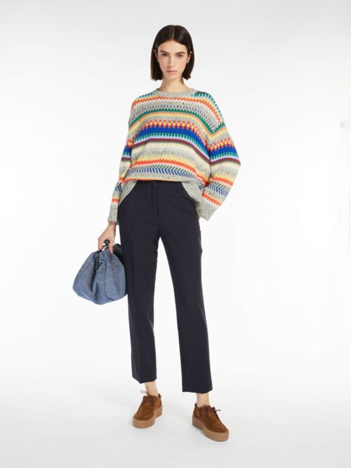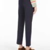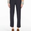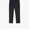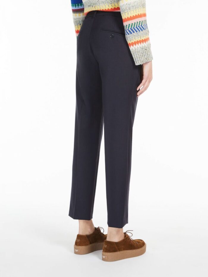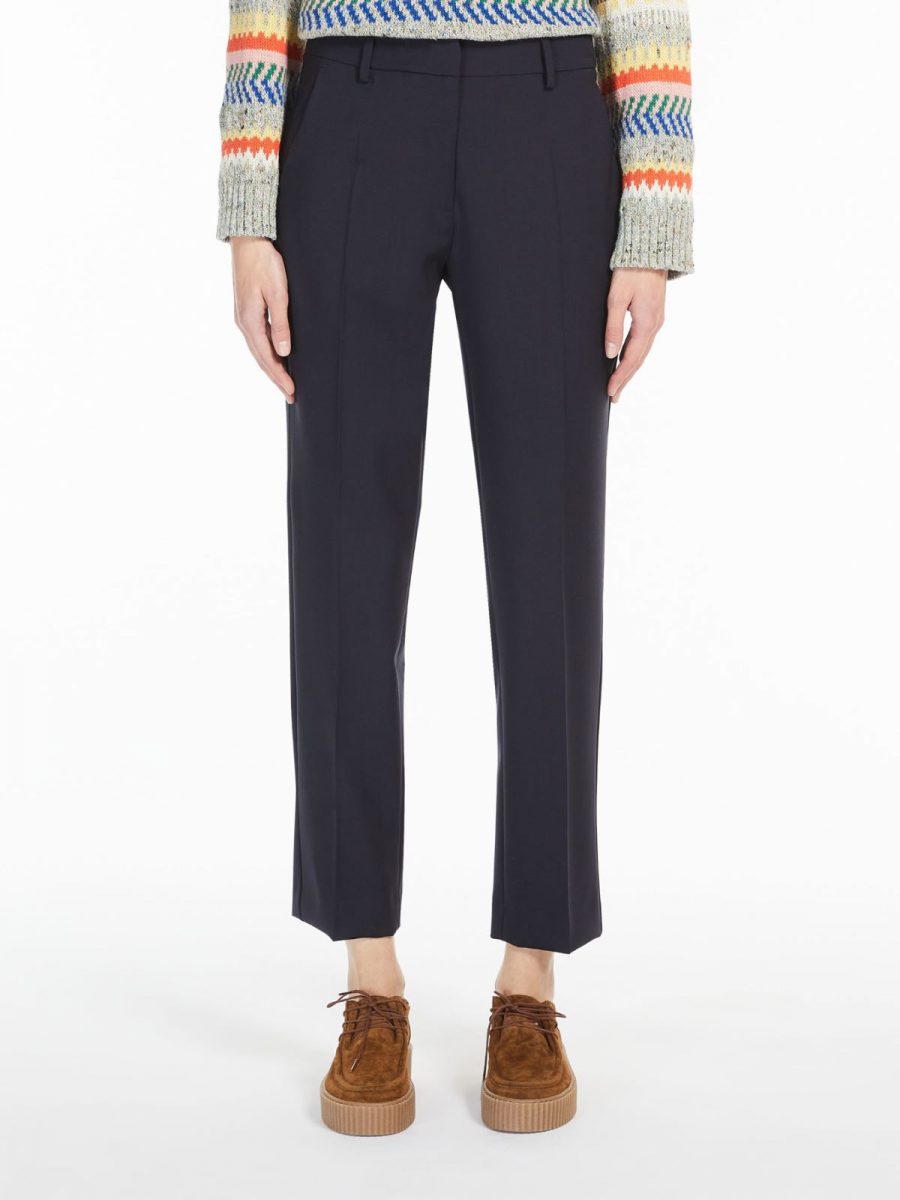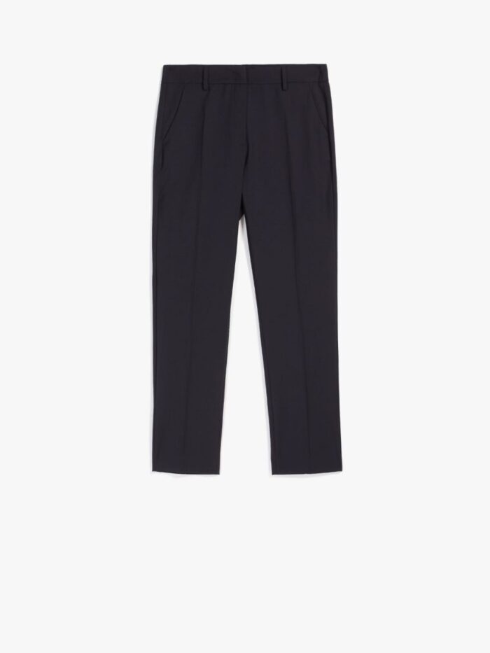 Stretch woollen cloth trousers featuring a zip and hook-and-bar fastening. The slim-fit model boasts slant front pockets and buttoned welt rear pockets.